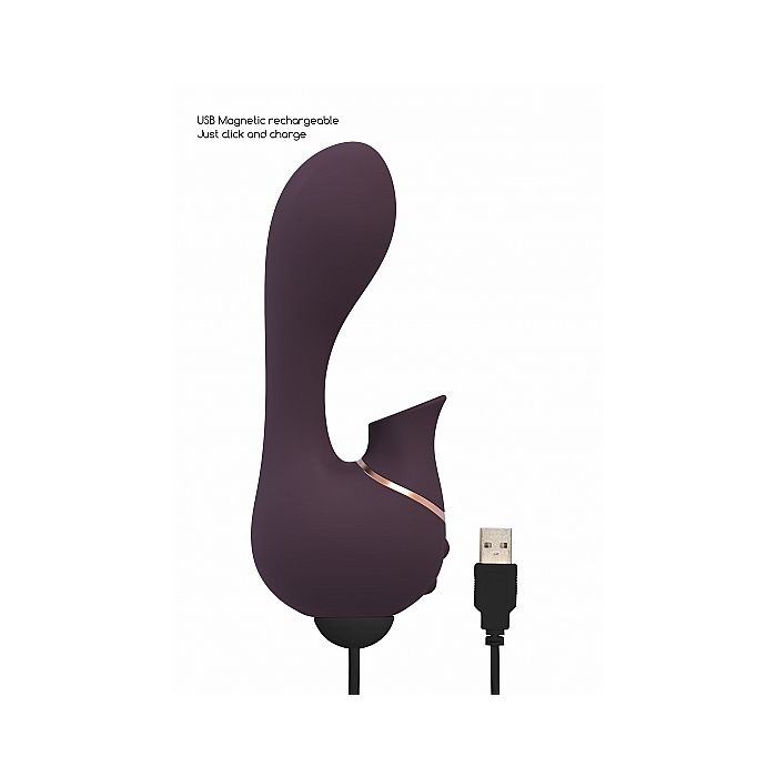 Deze Mythical vibrator paars van het merk Shots Irresistible combineert het genot van G-spot stimulatie met clitoris stimulatie. Maar niet zo maar clitoris stimulatie, de vibrator beschikt namelijk over een sensationele zuigende werking. Deze zuigfunctie zorgt voor een unieke sensatie waarbij een orgasme binnen no-time te behalen is. Ontdek het heerlijke genot en laat al je dromen werkelijkheid worden met deze Irresistible Mythical zuigende vibrator. Laat je niet verleiden door de lieflijke en paarse kleur van deze vibrator, want de Mythical beschikt over een super krachtige new generation F1 motor met maar liefst 11 snelheden en een flexibele kop. De flexibele kop past zich zonder problemen aan aan de vormen van jouw lichaam en de verschillende standen zijn gemakkelijk te bedienen met het push button systeem. Laat je G-spot beroeren en ontdek alle verschillende vibraties en sensaties. Welke stand is voor jou het meest plezierig? Ondanks de krachtige motor van dit speeltje, is hij zeer stil in gebruik. De Mythical maakt namelijk niet meer geluid dan 60 db. Zo kun je heerlijk onbezorgd van deze zuigende vibrator genieten wanneer je maar wilt. De Mythical heeft een mooi compact formaat zodat je hem ook zonder al te veel moeite overal met je mee naartoe kunt nemen. Met een lengte van 14,10 cm en diameter van 2,40 cm berg je de vibrator gemakkelijk op in je koffer of nachtkastje. Het zijdezachte siliconen materiaal van de Mythical voelt heerlijk aan tegen de huid. Wees gewaarschuwd, want na gebruik van deze heerlijk G-spot en clitoris vibrator, zal je lichaam regelmatig vragen om meer..
