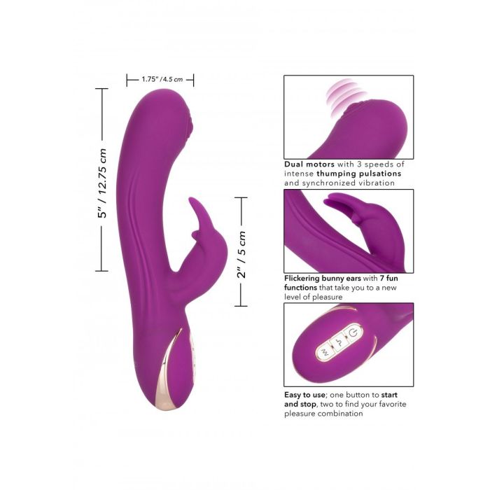 De Siliconen Vibrator Thumping Rabbit - Paars is een premium rabbit vibrator met 7 vibratiefuncties en 3 pulsatiesnelheden. Het heerlijke konijntje flikkert op het ritme van 7 opwindende functies om je clitoris te plagen en te prikkelen. De sensueel gebogen schacht en krachtige interne bonzende motor laten je genieten in moeiteloze stimulatie. Of je nu een avondje plezier neemt met je geliefde of je overgeeft aan een stomende solosessie, kijk uit naar maximaal 60 minuten genot. Laad je favoriete nieuwe toy weer op in slechts 2 uur met de meegeleverde USB-kabel. De flexibele stimulator is gemaakt van hygiënisch en hoogwaardig siliconen. Dit bodysafe materiaal is tevens waterproof en dus ook in de badkamer te gebruiken. De Siliconen Vibrator Thumping Rabbit - Paars komt in een luxe opbergdoos waar jij hem na gebruik discreet in kan opbergen.