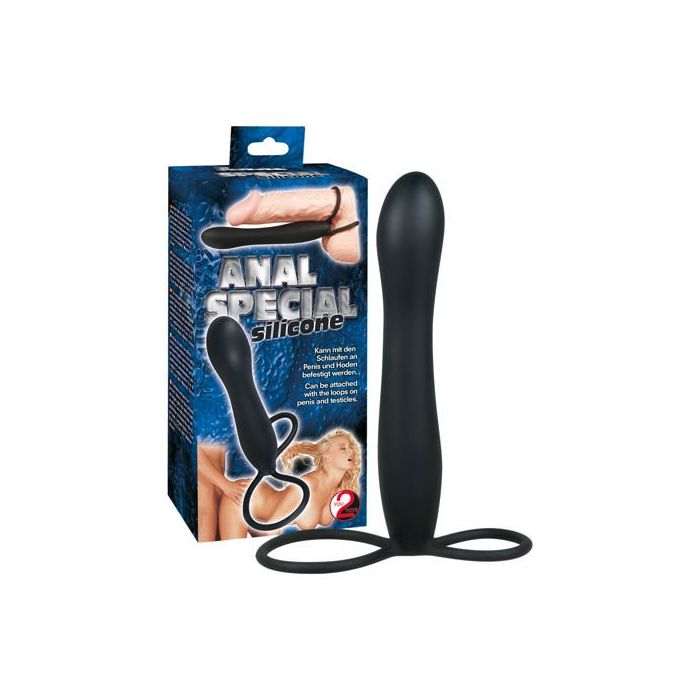 Zwarte anaal dildo welke aan de penis en ballen vastgemaakt kan worden. Deze anaal dildo heeft een ronde top en volgt de vormen van het lichaam, waardoor deze voor optimaal genot zorgt. Geniet samen nog meer van jullie intieme moment.