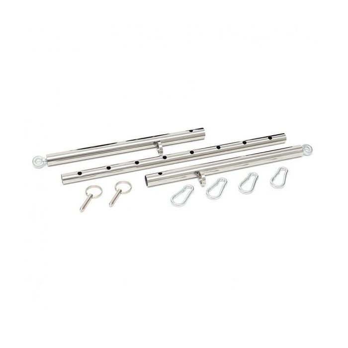 Breng jullie bondage spel naar een hoger level met deze geweldige spreidstang van het geweldige merk rimba. Met deze spreidstang met 4 ringen kan jij met je favoriete hand en enkel boeien je sub vastbinden in het standje zoals jij hem of haar graag hebt. De stang is verstelbaar in verschillende lengtes van 55 tot 85 centimeter. Bepaal helemaal zelf hoe wijd jij je sub wil hebben staan. Meegeleverd zijn 4 karabijnhaken om je sub snel en eenvoudig vast en los te klikken.