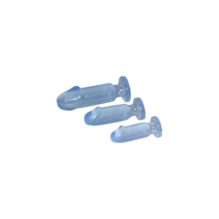 Het trainen kan beginnen met deze driedelige set met transparantie anaal dildo's in de maten small, medium en large. Begin met de kleinste dildo en bouw het op tot je kan beginnen met de grootste dildo. De flexibele dildo's zijn allemaal voorzien van een handige zuignap om ze gemakkelijk te kunnen plaatsten op gladde oppervlakten. Daarnaast zijn ze ook nog eens te gebruiken met strap-ons dankzij de platte onderkant!