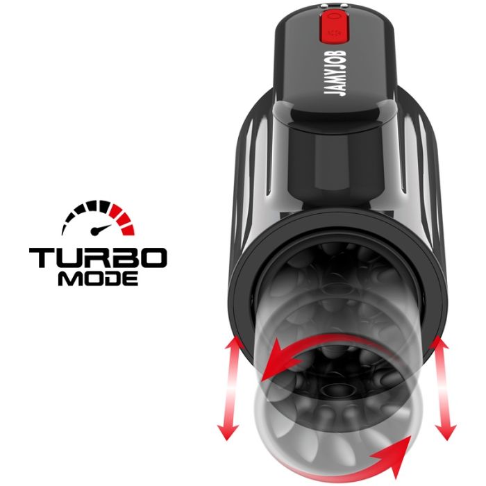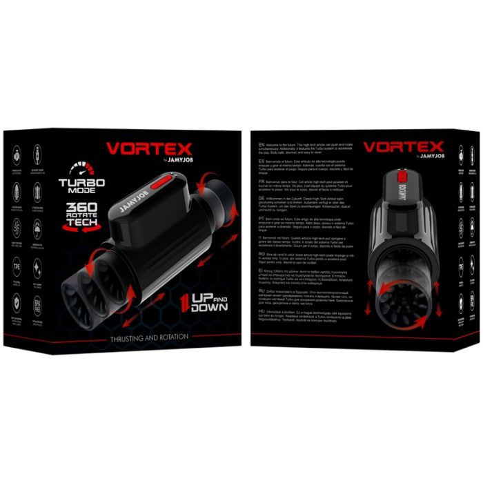 Ontdek de JAMYJOB VORTEX up and down masturbator, een luxe genotsspeeltje dat je zintuigen op een ongekende manier prikkelt. Met zijn strakke zwarte design en dieprode accenten is deze masturbator niet alleen een lust voor het oog, maar ook een meesterwerk van technologie. Geniet van maar liefst 10 verschillende stoot- en rotatiestanden, waarmee je de intensiteit van je ervaring volledig kunt afstemmen op je persoonlijke voorkeuren. Of je nu houdt van zachte strelingen of krachtige vibraties, de VORTEX heeft het allemaal. En met de ingebouwde 'turbomodus' ben je verzekerd van een extra spannende ervaring die je niet snel zult vergeten.
