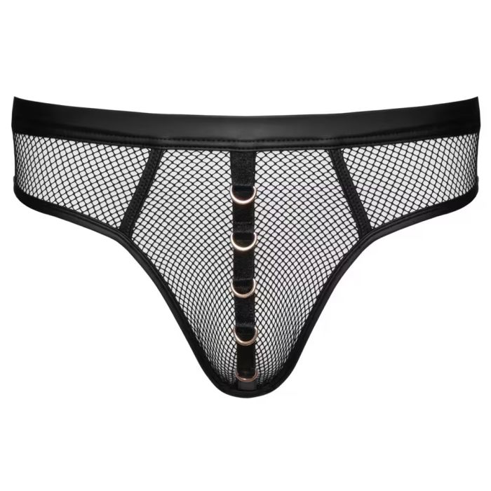 Deze opvallende onderbroek is vervaardigd uit luchtig netmateriaal dat niet alleen sexy is, maar ook een luxe uitstraling heeft dankzij de trendy wetlook details. De vijf decoratieve goudkleurige ringen op het zakje voegen een speelse, maar verfijnde touch toe, waardoor je je zelfverzekerd en aantrekkelijk voelt, ongeacht de gelegenheid.