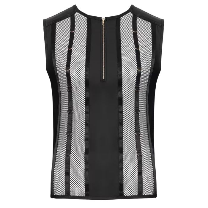 Dit unieke shirt is vervaardigd uit een onthullend netmateriaal dat naadloos samengaat met een trendy wetlook, waardoor je een gedurfde en modieuze uitstraling krijgt. Het elastische en zachte materiaal voelt heerlijk aan op de huid, wat zorgt voor een ongeëvenaard draagcomfort. De goudkleurige korte ritssluiting aan de voorkant voegt een vleugje luxe toe, terwijl de decoratieve goudkleurige ringen aan de zijkanten en boven op de rug een speelse en verleidelijke touch geven.