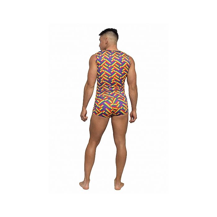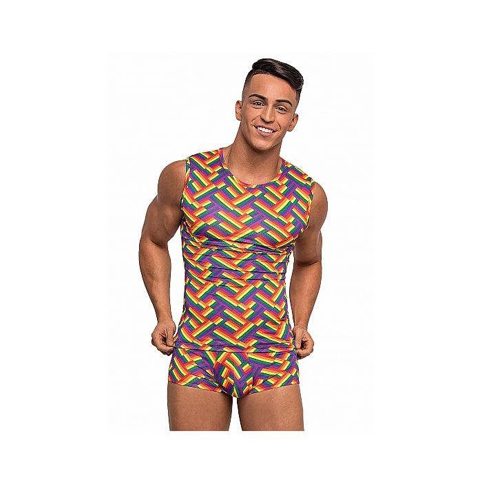 Ben jij nog op zoek naar een top die prachtig staat en tegelijkertijd een statement maakt? Vier de vrijheid met deze tank top met multiprint van het merk Male Power. De tank top heeft vrolijke pride kleuren die je kunt dragen tijdens een gezellig nacht stappen, maar ook in het dagelijks leven of tijdens je vakantie. De multiprint tank top is gemaakt van rekbaar en ademend materiaal waardoor hij een goede pasvorm heeft en zeer comfortabel is om te dragen. Ook wanneer het wat warmer is. Omdat de top geen mouwen heeft, komen je stoere mannelijke armen goed tot hun recht en zul je gegarandeerd de nodige aandacht krijgen. Wanneer trek jij deze vrolijke tank top van Male Power aan?
