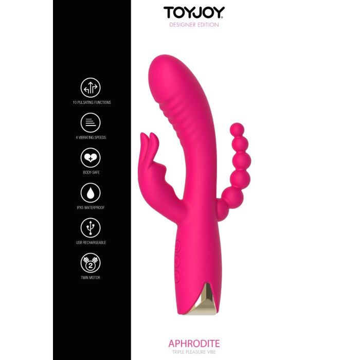 De Tarzan Vibrator Aphrodite Triple kom uit de ToyJoy Designer Edition collectie en is speciaal ontworpen om aan al je verlangens te voldoen. Aphrodite Triple heeft twee motoren, 10 vibratiestanden en 4 vibratiesnelheden. Deze 3-in-1 vibrator heeft een vibrerende schacht, een krachtige clitorisstimulator en stimulerende anaal balletjes. Hij is gemaakt van hoogwaardig siliconen en is 100% lichaamsveilig. Laad de vibrator gemakkelijk op met de bijgeleverde USB oplaadkabel.