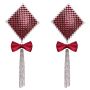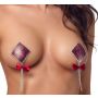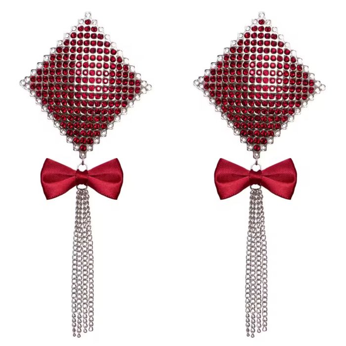 Deze prachtige stickers zijn versierd met glinsterende rode strassteentjes die de tepels op een betoverende manier accentueren. De zwaaiende kettingen voegen een speelse flair toe, terwijl het luxe rode satijnen strikje een vleugje elegantie en sensualiteit toevoegt. Dit accessoire is perfect voor een speciale gelegenheid of om jezelf gewoon eens te verwennen.