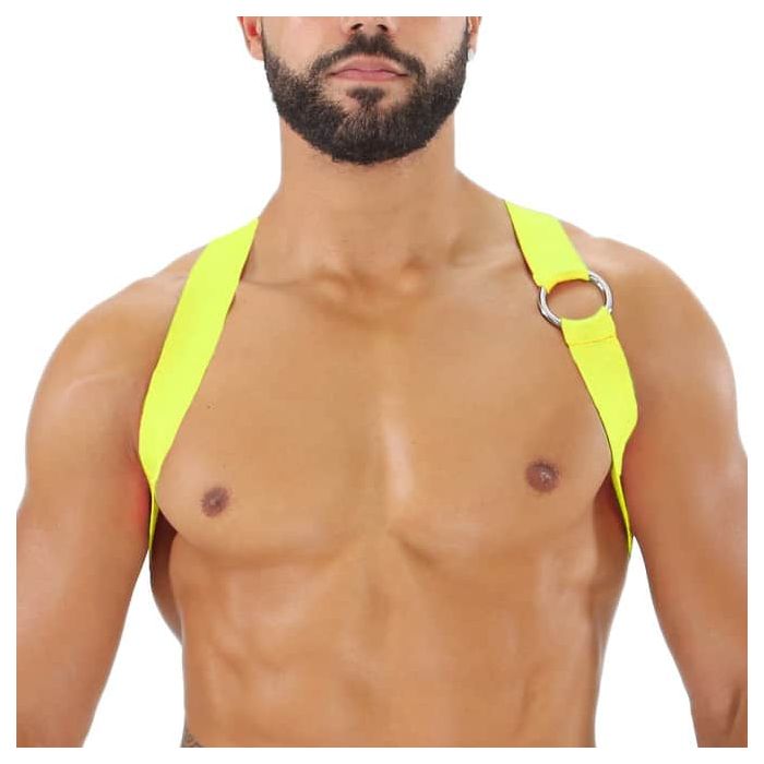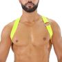 Laat jouw gespierde schouders nog breder lijken in het TOF Paris Party Boy Harnas - Neon Geel. Dit harnas is geheel gemaakt van elastische banden. Op de achterkant is het TOF embleem aangebracht. Het harnas heeft op de rug een X-model voor een comfortabele pasvorm en geaccentueerde schouders.