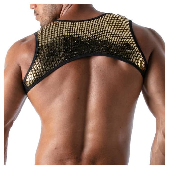 Ontdek dit te gekke harnas, namelijk de TOF Paris Star Pocket Harnas - Goud. Het harnas is gemaakt van een luxe stof en heeft een lekkere strakke pasvorm rond jouw gespierde schouders en laat jouw er nog breder en mannelijker uitzien. Het harnas heeft een ronde halslijn en het harnas heeft een prachtig goudkleurig dessin. Kortom, met het dragen van het TOF Paris Star Pocket Harnas - Goud is elke dag een feestje!