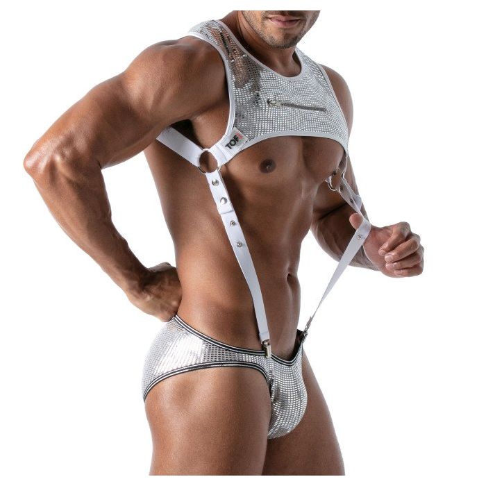 Met een harnas zoals de TOF Paris Star Pocket Harnas - Zilver laat jij jouw schouders en rug nog breder en extra gespierd lijken. De TOF Paris Star Pocket Harnas - Zilver geeft een extra en feestelijke uitstraling aan jouw gespierde bovenlichaam. Het harnas is gemaakt van soepele stof met prachtige glitters.