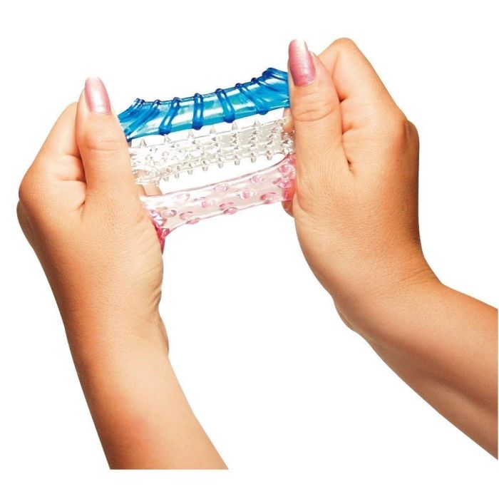 Soms is de erectie van je bedpartner niet genoeg om je een heerlijk gevoel te geven, dan ben je op zoek naar meer sensatie. En sensatie zal je krijgen bij dit tokyo sleeve set, dit set bestaat uit 3 heerlijke sleeves met elk hun eigen ribbels. Deze sleeves zorgen ervoor dat jij veel meer zal gaan genieten van de seks. De minimale diameter is 1,5 cm en ze hebben een lengte van 4,5 cm. Je hoeft niet bang te zijn dat de sleeves te klein zijn, want ze zijn enorm rekbaar! Dankzij dit set kun je eens afwisselen wordt de seks nog veel lekkerder dan normaal. Het is niet alleen voor jou lekker, ook je partner zal genieten van deze sleeves. Hij ziet jou natuurlijk genieten en de sleeves zorgen voor een beetje druk op zijn erectie.