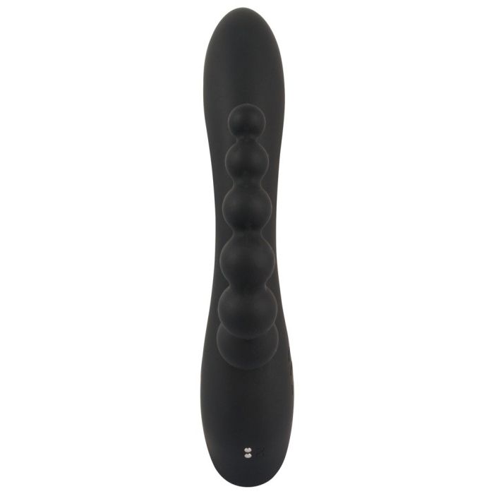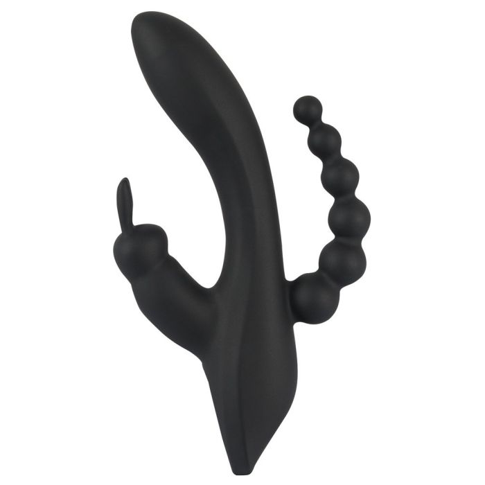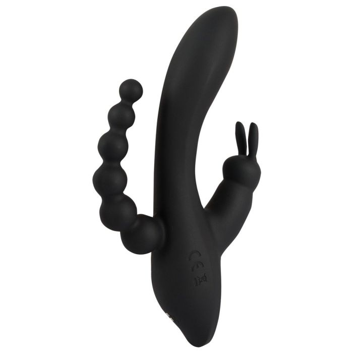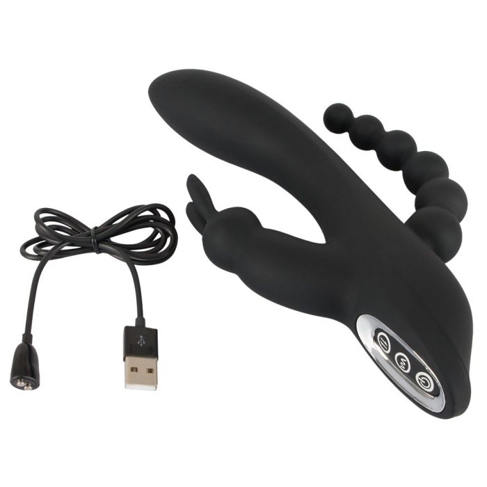 Met de Triple G-Spot Tarzan Vibrator - Zwart verwen tegelijkertijd je vagina, G-spot, clitoris en anus! En verdere stimulatie ben jij ook niet nodig. De anal beads hebben een taps toelopende vorm en zullen heerlijk 1 voor 1 je anus inglijden. De clitoris stimulator heeft de vorm van een schattig konijntje die zijn lange oortjes heerlijk tegen je clitoris zal laten tikken. De schacht is licht gebogen waardoor het bij penetratie van je vagina onherroepelijk je g-spot zal kunnen vinden. Alle motoren zijn ook afzonderlijk van elkaar te bedienen met het handige push button systeem. Met maar liefst 7 vibratie standen en 3 snelheden is jouw favoriet zo gevonden. Het zachte materiaal is zelfs op een natte huid te gebruiken want de tarzan vibrator is waterdicht. Na gebruik laad jij je favoriete nieuwe toy snel en makkelijk weer op met het meegeleverde usb kabeltje. Ook schoonmaken is super eenvoudig. Spoel het om onder de warme kraan met een anti bacteriële zeep en spuit de Triple G-Spot Tarzan Vibrator - Zwart in met een toycleaner.