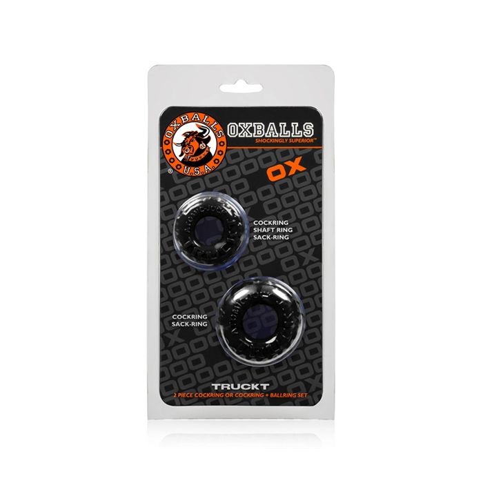 Geniet samen met je partner van jouw keiharde erectie met de zwarte Truckt Cockring Oxballs. Deze cockringen set bestaat uit 2 verschillende maten ringen gemaakt van zacht TPR. Dit materiaal is niet alleen zacht, maar ook super stretchy waardoor ze een goede pasvorm hebben en je ze kunt dragen zoals jij dat wilt. Zo kun je slechts één van de 2 cockringen dragen en hierbij afwisselen in maat (strakheid) of je kunt ze allebei tegelijk dragen. Doe er bijvoorbeeld één om de schacht van de penis en één rondom je balzak. Ontdek de verschillende manieren waarop je ze kunt dragen en de verschillende sensaties die dit teweeg brengt. Een hoop genot gegarandeerd!