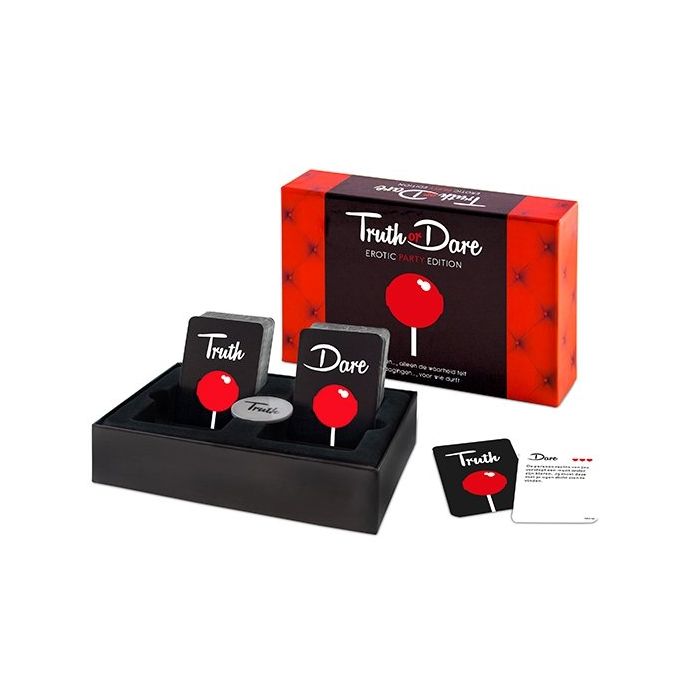 Speel jij ook weleens het spel truth or dare? Maar verzin jij dan altijd zelf de vragen en opdrachten? Tease & Play komt nu met een schitterende erotische party edition van het welbekende spel om elkaar beter te leren kennen. Zij hebben voor jullie de vragen en opdrachten samengesteld zodat het nog spannender wordt. Het spel bestaat uit 69 pikante vragen en 69 uitdagende opdrachten die beantwoord of uitgevoerd moeten worden. Het spel is bedoeld voor 3 of meer vrienden en is eenvoudig in gebruik. Met behulp van de flipcoin bepaal je welke kaart gepakt moet worden. Bij Truth kaart verdien je alleen punten met een eerlijk antwoord. Hoe gedetailleerder, hoe beter. Bij een Dare kaart krijg je punten als je de uitdagende opdracht volbrengt. Wil je de vraag liever niet beantwoorden of een opdracht echt niet doen? Geen probleem, maar dan worden de punten bij jou wel in mindering gebracht. Alles mag, maar niets moet. Hoe ver durven jullie te gaan?
