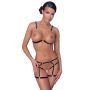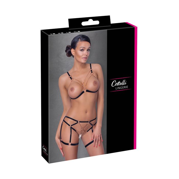 De bh heeft zwarte, verstelbare schouderbandjes en een zwart bandje loopt onder de borsten door en over de rug. De cups zijn helemaal open en kettingen en ringen omlijsten de borsten. De kettingen en ringen komen terug in de jarretel slip, met name in het open kruis. De zwarte bandjes zitten als een slipje rond jouw taille en dijen.
