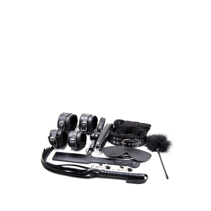 Het ultieme cadeau voor liefhebbers van bondage of voor beginners. De set bevat maar liefst 10 items die met zorg is samengesteld voor een complete bdsm ervaring. De pols en enkel boeien en de kraag zijn gevoerd met een zachte imitatiebont voor een luxueuze uitstraling en comfortabel gevoel. De grootte kan worden aangepast met de metalen gespsluitingen. De kunstleren riem kan aan de kraag worden bevestigd door middel van een karabijnhaak en D-ring. De ballgag kan worden aangepast met een gesp op de halsband , de bal is glad, smaakloos en reukloos en blijft comfortabel om te dragen dankzij de ademhalingsopeningen. Een PVC-afdekking op de uiteinden van de metalen tepelklemmen beschermt de huid en zorgen ervoor dat de klemmen niet snel afglijden. De druk kan worden aangepast met de schroeven, voor ultieme knijpcontrole. Met deze bondage set is het mogelijk om te genieten van veel verschillende BDSM situaties en posities. Beginners kunnen bondagespel leren kennen en de opwinding ontdekken van het spel. Meer ervaren BDSM-liefhebbers zullen alles vinden wat ze nodig hebben in deze set voor een goede bondagesessie.