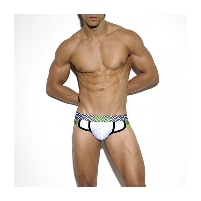 Deze heren slip is gemaakt van ademend mesh, waardoor je je de hele dag fris en vrij voelt, of je nu aan het sporten bent of gewoon lekker thuis ontspant. De frisse contrasterende kleuren en de geometrische print op de brede elastische tailleband geven deze boxer een trendy uitstraling.