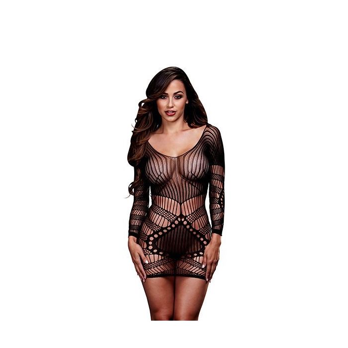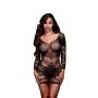 De spannende combinatie van geometrische patronen en kanten materiaal maakt van dit mini jurkje een sexy item wat het altijd perfect zal doen in de slaapkamer. De lange mouwen en het diepe decolleté steken perfect af en zorgen voor een spannende en sexy combinatie. Het rekbare materiaal zorgt ervoor dat het jurkje op elk lichaam de perfecte pasvorm heeft.
