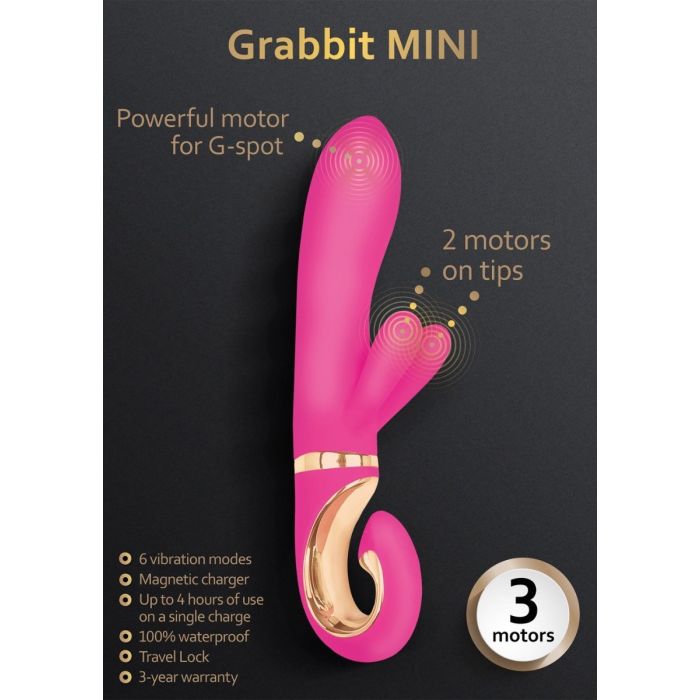 De Vibrator Grabbit Mini van het merk CalExotics is gemaakt van hoogwaardig siliconen. Het is bijna niet te geloven hoe realistisch het materiaal aanvoelt. Dit hoogwaardige lichaamsvriendelijke siliconenmateriaal voelt zo dicht mogelijk aan bij het menselijk vlees en warmt op om nog meer als echt aan te voelen. Ecologisch veilig, hypoallergeen, premium "Bioskin" is niet-poreus siliconenmateriaal van medische kwaliteit.De vibrator heeft 3 krachtige motoren, Eén in de schacht in de punt zit, en twee motoren in de kleine oren om de clitoris te stimuleren. Door de licht gebogen schacht stimuleer je de g-spot. Grabbit Mini is oplaadbaar in 2 uur en helemaal opgeladen geniet je 4 uur van de heerlijke trillingen. Neem de vibrator mee onder de douche of in bad want de vibrator is waterdicht.