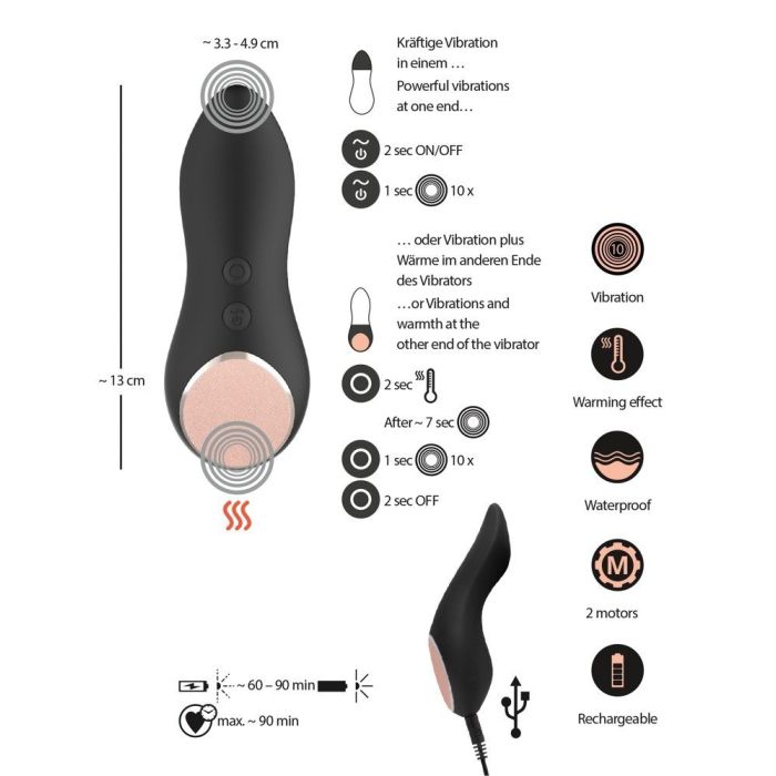 De Vibrator Warming Touch van Cupa kan aan beide zijden worden gebruikt voor veelzijdige verwenmassages over het hele lichaam. De vibrator is ergonomisch gevormd zodat hij perfect in de hand ligt. Je kunt de 10 vibratiestanden afzonderlijk van elkaar bedienen met één druk op de knop. De Warming Touch Vibrator masseert en verwent met krachtige vibraties en extra aangename warmte aan één kant. Wanneer de vibrator leeg is laad je hem gemakkelijk op met de meegeleverde USB oplaadkabel.