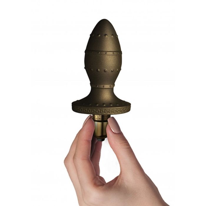 Deze luxe buttplug van Rocks Off is een lust voor het oog. De gouden plug kan in een simpele handeling worden omgetoverd tot een vibrerende parel. Met zijn krachtige uitneembare bullet vibrator kan je genieten van 10 verschillende vibratiestanden die eenvoudig met een simpele druk op de knop te activeren zijn. De buttplug is gemaakt van zijdezacht siliconen en beschikt over een geribbelde structuur dat voor een extra stimulatie zorgt. Advies: gebruik uitsluitend een glijmiddel op waterbasis bij dit type speeltje.