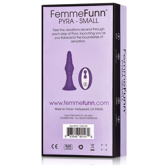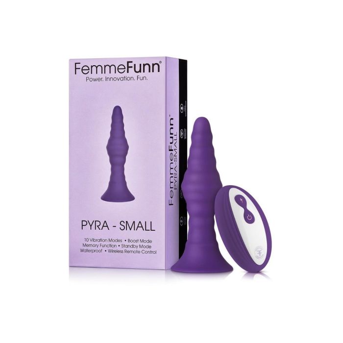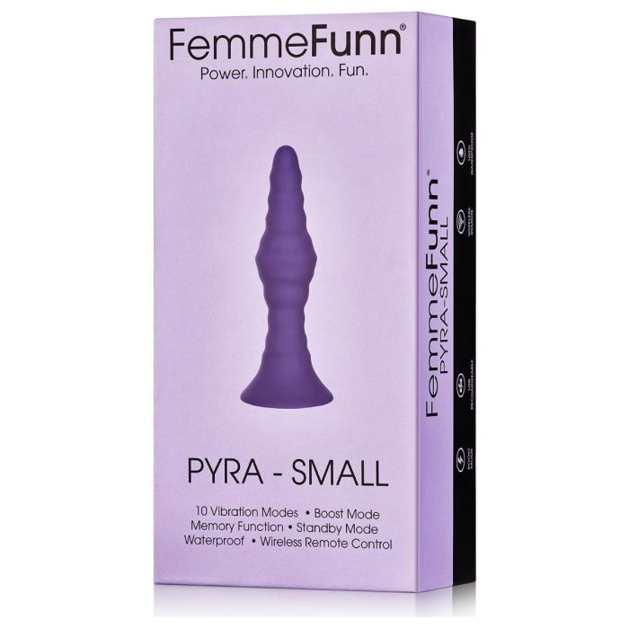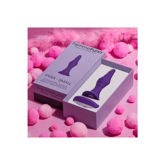 De Vibrerende Buttplug Pyra Small van Femme Fun biedt opwindend anaal spel met 10 krachtige vibratiestanden, een taps toelopende vorm en golvende textuur. Door de afstandsbediening en krachtige zuignap geniet jij handsfree van de heerlijke standen. Daarnaast is de zuignap ook te gebruiken in combinatie met een harnas. Pyra is gemaakt van eersteklas lichaamsveilige siliconen, voelt zacht aan en is gemakkelijk schoon te maken. Neem Pyra Small mee onder de douche of in bad, de buttplug is namelijk 100% waterdicht.