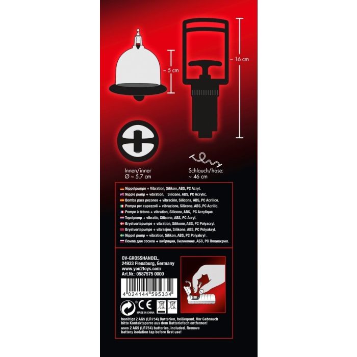 Deze Tepelcups hebben de mogelijkheid om heerlijk je tepels naar voren te trekken terwijl je ze ook nog eens verwent met heerlijke trillende vibraties. Verbind de pomp met een van de cups en zet de bullet alvast aan. Plaats de cup over 1 van de borsten en pomp tot jij het gewenste effect hebt bereikt. Verwijder nu de pomp, De cup behoud automatisch het vacuum, en herhaal alles met de andere borst. Wanneer jij de cup wilt verwijderen druk jij de rode pin in en je kan de cup snel en eenvoudig verwijderen. De tepelzuigers zijn ook zonder de bullets te gebruiken. De handpomp is 16.00 cm lang en de slang is 46.00 cm lang zodat jij alle bereik hebt om het geheel effectief te gebruiken.