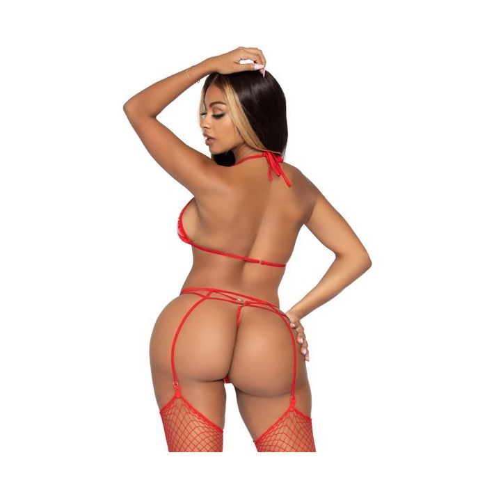 Je voelt je een echte wild thing in de Vinyl Top, String en Jarretelgordel - Rood van Leg Avenue! Deze driedelige set bestaat uit een bralette top, een string en een jarretelgordel. De set is gemaakt van smalle bandjes en glanzend, fel rood wetlook vinyl. Lekker kinky dus!