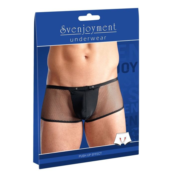 Deze boxer komt uit de collectie van Svenjoyment Underwear en heeft een zeer opwindend uiterlijk. In deze short zie jij er super sexy uit doordat de boxer bijna geheel van doorzichtig visnet stof is gemaakt. Je zult in deze boxer dus niet veel aan de fantasie te over laten. Het kruis is gemaakt van zacht microvezel materiaal wat heerlijk aanvoelt voor een hoog draagcomfort. Rond de pouch is een koord door de stof geregen zodat je de pouch kunt aanpassen aan jou wensen. Trek de pouch strak aan om je zaakje een lekker lift te geven.