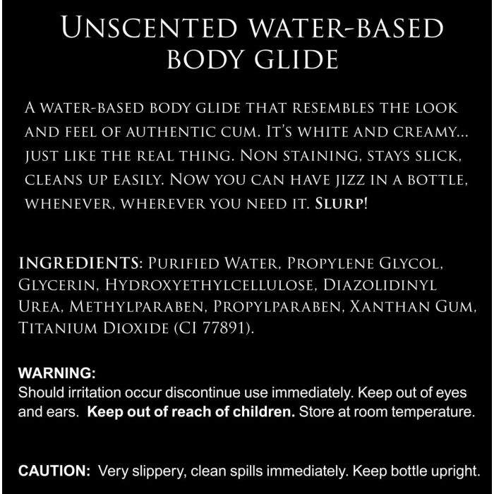 De Jizz Body is een unieke watergebaseerde glijmiddel die de textuur van sperma nabootst voor een natuurlijke en sensuele ervaring. Met zijn romige, witte consistentie biedt deze geurvrije formule een langdurige gladheid die je intieme momenten naar een hoger niveau tilt. Geen zorgen over vlekken, want Jizz Body laat geen sporen achter en is eenvoudig af te spoelen met water en zeep. Perfect voor gebruik op de huid, deze glijmiddel is speciaal ontworpen voor extern gebruik en zorgt ervoor dat je je volledig kunt concentreren op de plezierige momenten zonder afleiding. Houd de fles rechtop voor optimale gebruikservaring en geniet van een soepele, zorgeloze ervaring met Jizz Body!