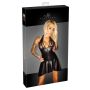 Deze prachtige halterjurk zal een geweldige toevoeging worden aan jouw kledingkast. In deze jurk shine jij altijd en heb jij gegarandeerd binnen no time een lekkere kerel aan de haak geslagen. Hij sluit achter in de nek en heeft doorschijnende netstof cups waar zwarte wetlook banden overheen lopen. Naar beneden toe loopt deze wetlook halterjurk wijd uit waardoor jij de vrijheid hebt om je heerlijk te bewegen op de dansvloer. Van voor is hij iets korter dan van achteren voor een extra sexy look. Draag je mooiste pumps onder dit jurkje om je outfit af te maken en jij zal onweerstaanbaar zijn.