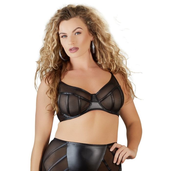 Deze schitterende beha mag absoluut niet ontbreken in je collectie ondergoed. Het materiaal is gemaakt van een combinatie van transparant mesh met wetlook banen over de beha heen. Hij zal de gehele borst bedekken en door de beugel zal hij je borsten een perfecte ondersteuning geven. De bandjes over de schouders heen zijn verstelbaar en op de rug is de beha te verstellen met 3 haakjes op 3 standen. Hij is mooi te combineren met de Wetlook Slip met Jarretels - Zwart voor een complete look.