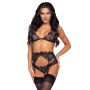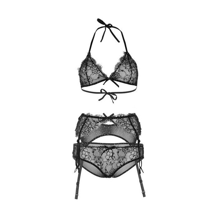 De triangel top heeft kanten cups zonder beugels en is gemakkelijk op de juiste maat vast te strikken achter de nek en op de rug. Wissel de look af door de bandjes gekruist over de borst te dragen. Tussen de cups is een strikje aangebracht. De jarretelgordel heeft een hoog model en wordt rond de middel gedragen. De jarretel heeft 4 verstelbare bandjes met kousvriendelijke clips. Het sierlijke kant en het micro mesh zijn versierd met strass steentjes voor een feestelijk resultaat.