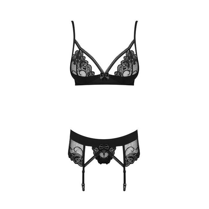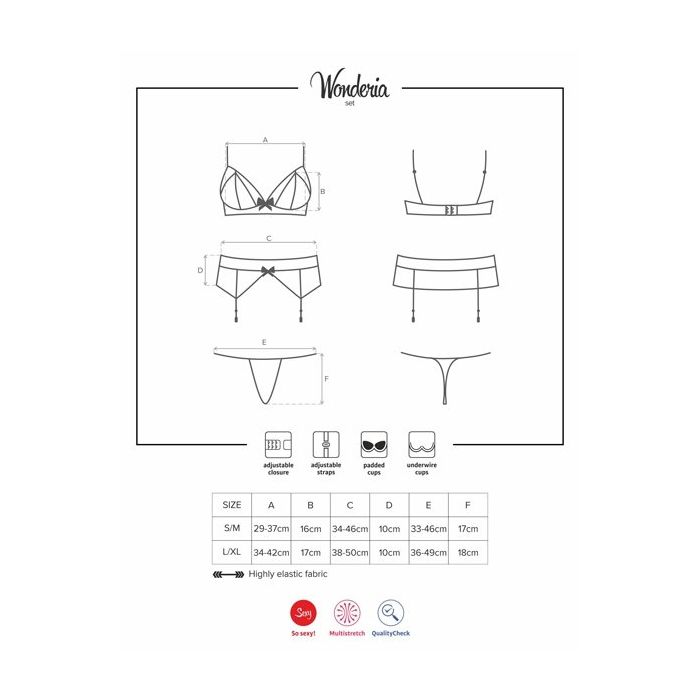 Have a wonderful night! In de Wonderia Set - Zwart van Obsessive zal dat zeker wel goed komen! Deze verleidelijke set bestaande uit een bh, een jarretelgordel en een string is gemaakt van heerlijk zachte, multistretch materialen voor een perfecte pasvorm en een luxe uitstraling. De cups van de beugel bh bestaan uit gevoerde kwartcups en doorschijnend kant met speelse sierbandjes voor een super sexy decolleté.