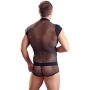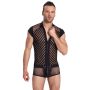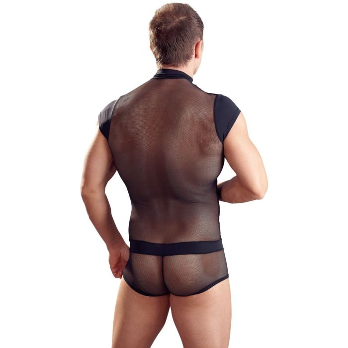 Deze zwarte body van Svenjoyment zal je er ontzettend sexy uit doen zien. De body is gemaakt van zacht en rekbaar materiaal voor een perfect, nauwsluitende pasvorm. Het transparant zwarte netstof materiaal is voorzien van een streepjes patroon wat jouw mannelijke figuur complimenteert. De playsuit heeft een opstaand kraagje, kapmouwen en korte pijpjes. Aan de voorzijde is een rits aangebracht op de borst en op het kruis. Zo kun jij je borstspieren goed showen terwijl je partner de andere rits losmaakt.