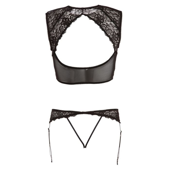 Verras je geliefde door te verschijnen in dit ontzettend opwindende setje uit de Abierta Fina collectie. Dit setje bestaat uit een top en een jarretelstring. Het zwarte kant van de top sluit zich prachtig om je lichaam en de vorm van de top accentueren jouw heerlijke figuur. De top heeft een diep decolleté met diamanten hanger in het midden en de rug van de top is open. De elegante jarretel string is net als de top gemaakt van zacht elastisch kant en zich perfect om je heupen. Het kant van het open kruisje omlijst je vagina en maakt je zeer toegankelijk.