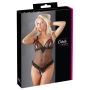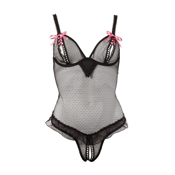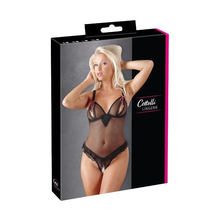 In deze doorschijnende body van Cottelli Collection kun jij heerlijk op verleidingstour. Deze zwarte body is gemaakt van transparant materiaal dat heerlijk zacht en soepelis voor een zeer aangename pasvorm. De soft cups zijn open, waardoor je goed met je borsten kunt pronken. Over de heupen lopen sierlijke ruches en het kruisje is vanaf de voorkant tot op je stuitje open, zodat jouw meest intieme zones goed bereikbaar zijn. De open cups en kruisje zijn luxe afgewerkt met fraaie randjes en roze strikjes. In deze body zul je er oogverblindend en onweerstaanbaar uitzien!